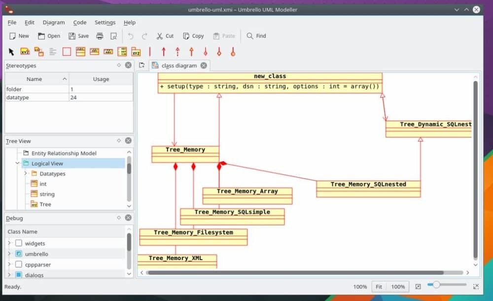 Umbrello UML Modeller is a Unified Modelling Language (UML) diagram program based on KDE Technology. It allows you to create diagrams of software and other systems in a standard format to document or design the structure of your programs. It uses an XMI-based file format.