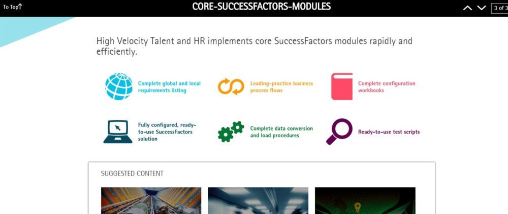 High Velocity Talent and HR provides all the standardization needed to implement core SuccessFactors modules rapidly and efficiently. It also contains the complete end-to-end project deliverables required to successfully support all aspects of the SuccessFactors implementation lifecycle.