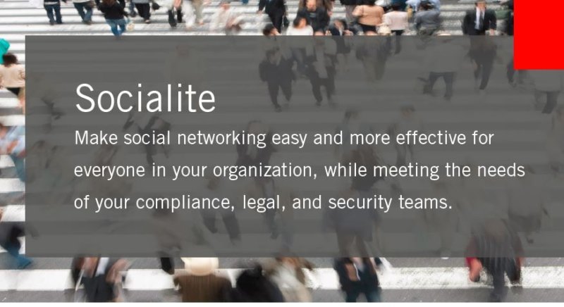 Socialite 2015 provides new productivity features that augment the native experience with widgets for a new Content Library, Social Scoring and Life Events. These features are available directly from the Socialite toolbar atop the native social site, enabling users to easily access approved corporate content, compare their social ranking to their coworkers and be alerted of recent life events without having to switch to a different user interface.
