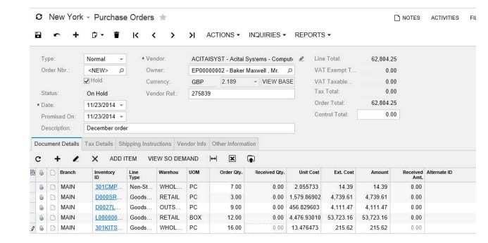 Acumatica creates different approval rules based on the type of order, vendor information, order amount, and other order specific information. Acumatica tracks when purchase orders are received. Acumatica automatically creates accounts payable vouchers when goods are received for complete, partial, or consolidated orders.