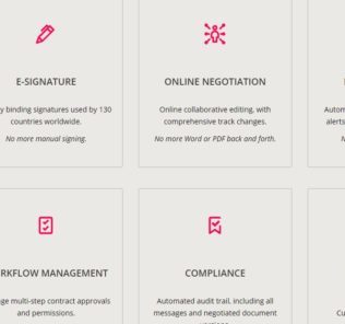 • Complete Audit Trail: Automatically create a full audit trail for every contract • Built-in OCR: Automatically convert image files such as JPG, PNG, or PDF into fully searchable text documents • Fine-grained security permissions • One-click Contract Creation • Automatic Redlining: Eliminate the problem of rogue edits slipping by unnoticed • Flexible Approval Workflows • Configurable Tables and Forms