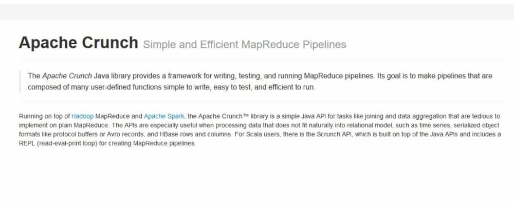The Apache Crunch Java library provides a framework for writing, testing, and running MapReduce pipelines. Its goal is to make pipelines that are composed of many user-defined functions simple to write, easy to test, and efficient to run.