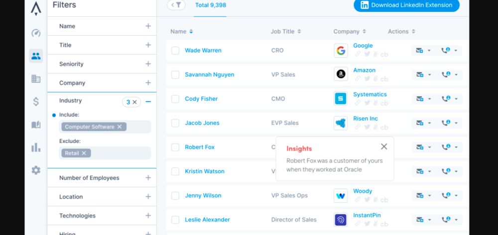• Prospect Searcher: Find people and companies in your ideal customer profile with laser precision. • Database: 200M contacts, 10M businesses, verified emails, direct dial phone numbers, 65+ data attributes. • LinkedIn Prospector: Prospect on LinkedIn, sync emails and direct dial phone numbers to your CRM, instantly.