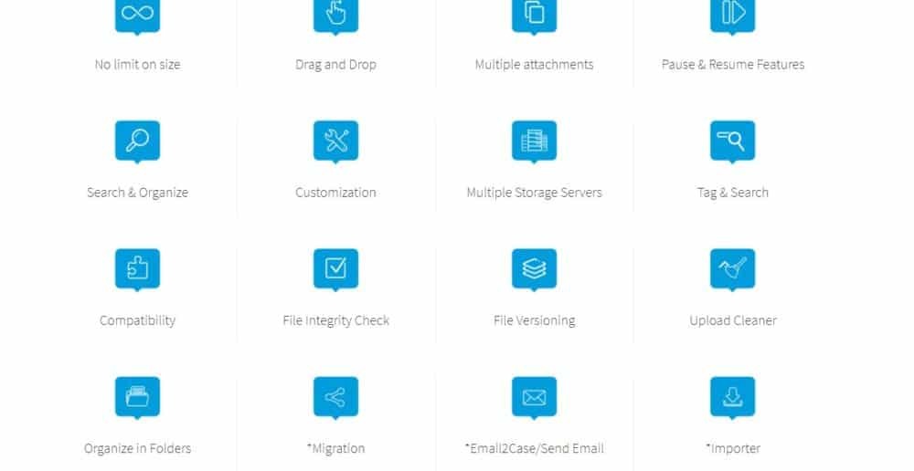 Search and organize which is useful for finding attachments in folders based on record of the attached file; customization allows adding custom fields on attachments record; multiple storage services for storing attachments; tag and search, compatibility which means that Salesforce users can run Salesforce reports on Attachments; file integrity check where users can check if uploaded file is corrupted or not to guard against security threat; file versioning allows uploading different versions and access on require; in order to avoid unnecessary space utilization users can delete partially uploaded files using upload cleaner.
