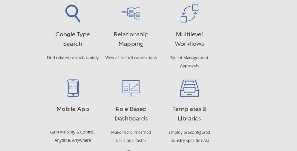 • Google Type Search • Relationship Mapping • Multilevel Workflows • Mobile App • Role Based Dashboards • Templates & Libraries • Growing Ecosystem