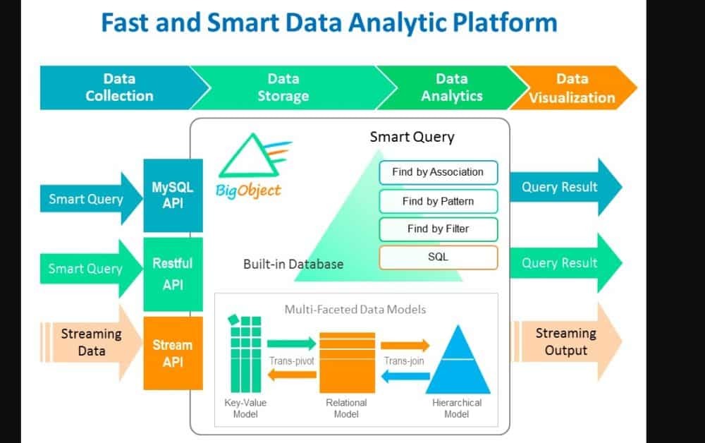 BigObject is a solution provider that enables Smart Data Analytics (SDA). SDA platform addresses the new challenges raised by big and complex data. SDA platform also delivers responsiveness with patented In-Data Computing technology. It achieves smartness by transforming big and complex data into actionable insights. BigObject provides transformational in-data computing technology to enable users’ data computing real time, at scale, and with high ease of use. Besides performance, BigObject Platform offers four overall values in analytic power, multi-model database, small footprint, and cost of ownership. BigObject can perform fast and smart queries with In-Data Computing technology where complex logics are pushed down into the database to achieve the optimal computing. It allows users to use simple query language to effortlessly attain the result. At the same time, users can also conduct domain specific searches and create domain specific terms with user-defined patterns. BigObject enables users to perform complex analytics while keeping their know-how in disguise. Moreover, BigObject supports multi-faceted data models, relational model (i.e. tables), hierarchical model (i.e. trees) and key-value model (i.e. semi-structured data), which are mutually transformable. Depending on the applications' requirements, the users have the flexibility to select among those models. With only 4MB in footprint, BigObject can enable data analytics in Raspberry Pi 2 with good performance. The overall cost of ownership for BigObject is low. It requires low resources (RAM and storage) and low cost per query. With today’s 64-bit architecture and virtualization technology, BigObject depicts a persistent and nearly infinite memory space for data.