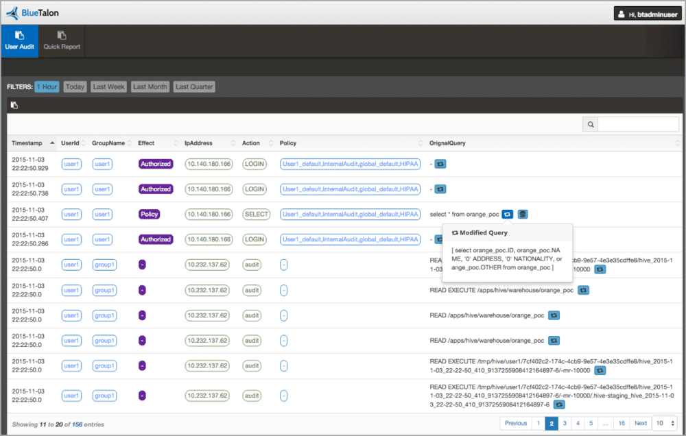 BlueTalon delivers leading data-centric security for Hadoop, SQL and big data environments. Leading enterprises use BlueTalon to control their data by giving users access to the data they need, and not a byte more. The BlueTalon Policy Engine provides precise authorization, fine-grained filtering, dynamic data masking, stealth analytics and auditing across applications and enterprise data stores.