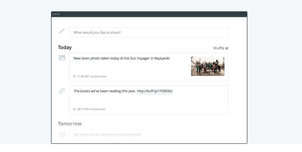 Buffer also has extensions, apps and extras like Zapier, If This Then That, Pablo (new), Feedly, Pocket, Reeder, ReviewPush, Crowdriff, Echofon, Trap.it, Tweetcaster, Followerwonk, Mr. Reader, Feeddler, Instapaper, Scoop.it, Bottlenose, Flare, Commun.it, Digg Digg for WordPress, Buffer via Email, Social Bro, Tweetings, Tracky, Tweriod, Twitter, Drafts, Twylah, ViennaRSS, Tweet4me, The Buffer Button, Bulk Buffer, News Mix, Caffeinated, WordPress, edocr, RSSOwl, Wren, Bufferti.me, paper.li, Kippster, Sidebar, Shareaholics, NewsBlur, CoSchedule, Fliplingo, Mention, iPositioning, Save As Image, Nextgen Reader, Start A FIRE, Neatly, Quuu, Curata, Crate, Hypesocial, Flowxo, Upflow, Hiplay, PromoRepublic, Social Warfare, Integromat, Filtr8, Backly and Vid.One to share and make videos, photos and content and drive traffic to user’s social media. Pre-set date and times for each post are available and can be adjusted or added to user’s queue at anytime and anywhere users are reading.