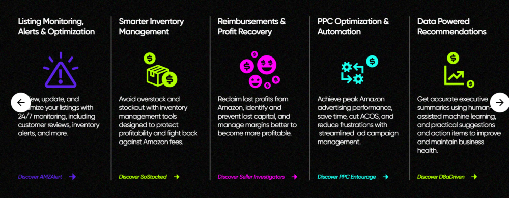 Listing Monitoring, Alerts, and Optimization: The platform provides 24/7 monitoring of Amazon listings, including customer reviews and inventory alerts, to help users review, update, and optimize their listings effectively.