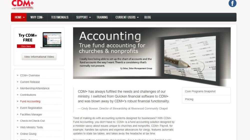 CDM+ Accounting is a fund accounting software designed to solve issues unique to churches and non-profits. CDM+ Accounting handles a variety of issues that include tax options and expense allowance for clergy, automatic updates to state tax tables, and makes the tax processes much more comfortable and quicker.