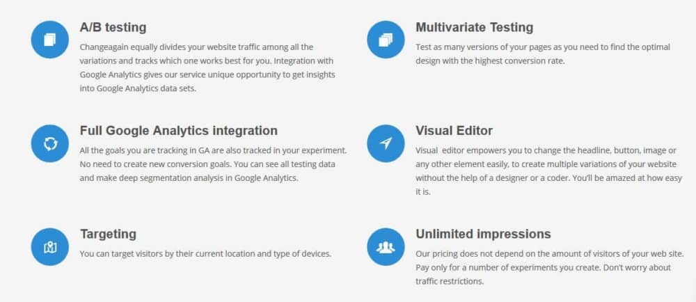 ChangeAgain lets the user test multiple versions of pages to get the best design to ensure maximum conversion rate. The visual editor makes it possible to edit important sections of the app such as headlines, buttons, images or any other elements easily with no need to hire professional designer at all.