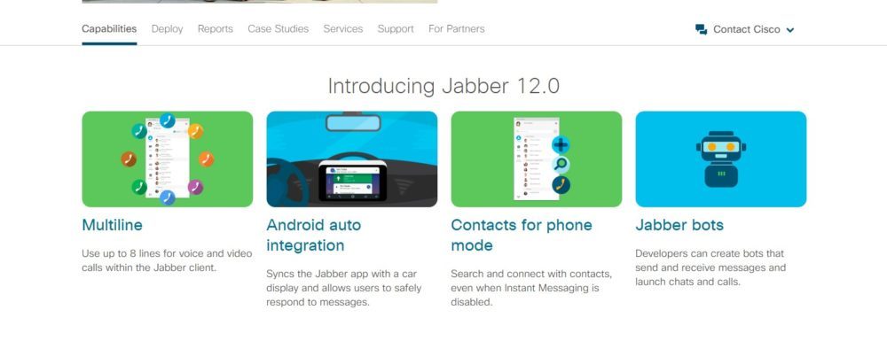 Cisco Jabber delivers instant messaging, voice and video calls, voice messaging, desktop sharing, conferencing, and presence.