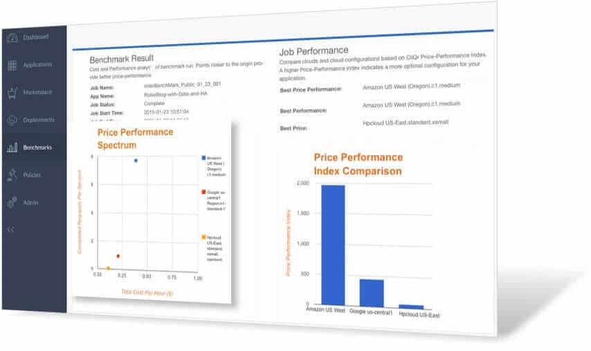 The CloudCenter platform automates benchmarking the price, performance and price-performance index of each actual application, simultaneously across any cloud, instance type or provider, so you can pick your target before you deploy.