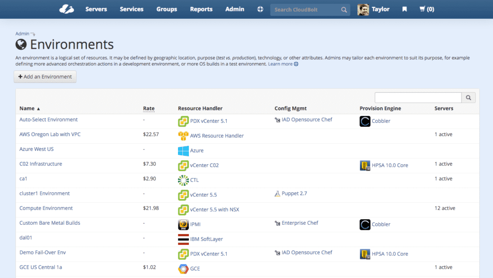 CloudBolt unifies the reporting, provisioning, and management of private and public environments, providing a single pane of glass for IT admins and their internal and external customers. CB supports 14 different resource handlers (virtualization and public cloud technologies), with the ability to rapidly add new technology support. CloudBolt also integrates with configuration managers (ex. Puppet and Chef), IPAM solutions (ex. Infoblox), CMDBs (ex. ServiceNow), and all other systems involved with server management so end-to-end builds can be performed in one step and one UI or API.