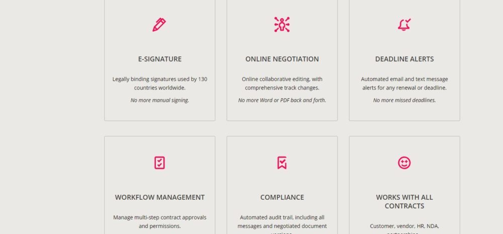 Concord provides a variety of services in relation to contract management such as electronic signature, online negotiation, and compliance among others. It has grown to become a venue for collaboration and it is currently trust by 30,000+ companies in the world from freelancers to large businesses for their contract management needs. Concord provides a number of essential features required for effective follow-through after the contract has been executed. Deadline alerts ensure users get to take advantage of new opportunities and managing contract performance.