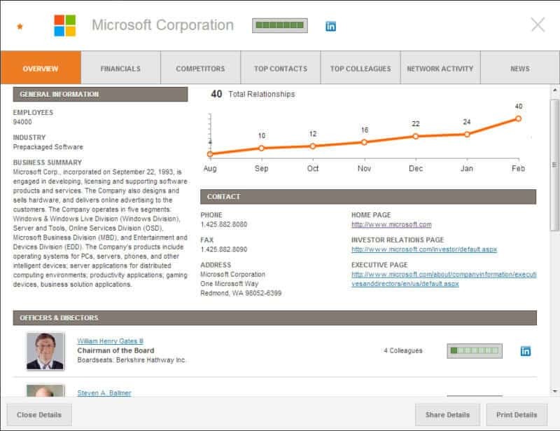 ContactNet is one of the best enterprise relationship management solutions. It uncovers potential relationship assets that are hiding in email patterns, calendars, address books, and contact management systems and utilizes them for the users. Existing relationships and new ones can be easily leveraged from within your organization and outside through social media contacts and then turned into opportunities. Company profile gives users immediate access to the Thompson Reuters company database including businesses and financial data, officers, directors and even competitors. Contactnet provides access to relationship intelligence with no additional data entry or maintenance. It also adds relationship intelligence to company initiatives like annual business planning, developing and retaining clients also prioritizing target clients, RPF responses, cross selling and much more. Relationship data is automatically captured by monitoring multiple data sources and applying advanced data analytics. It enhances data with automatic collection of email signatures ensures complete contact profiles and enhances the accuracy of the firms relationship info relevance. It implements a 38 letter algorithm to rate colleague’s relationships strength to clients or industries. The Thomas Reuters team of experts provides project management, consultation, support, system monitoring and training to ensure users get maximum benefit from Contactnet. It offers a strong security system by providing a high customizable privacy policy configuration that enables users to share information without having to divulge any personal or private information. Users get instant access to 27 million company profiles and can get instant data access and insights from anywhere with a tablet friendly design.