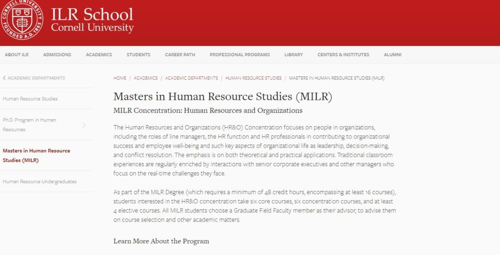 The Cornell University’s Masters of Human Resource Studies (MILR) program, otherwise known as, Human Resources and Organizations (HR&O) concentration, focuses on people in organizations, including the roles of line managers, the HR function, and HR professionals in contributing to organizational success and employee well-being.