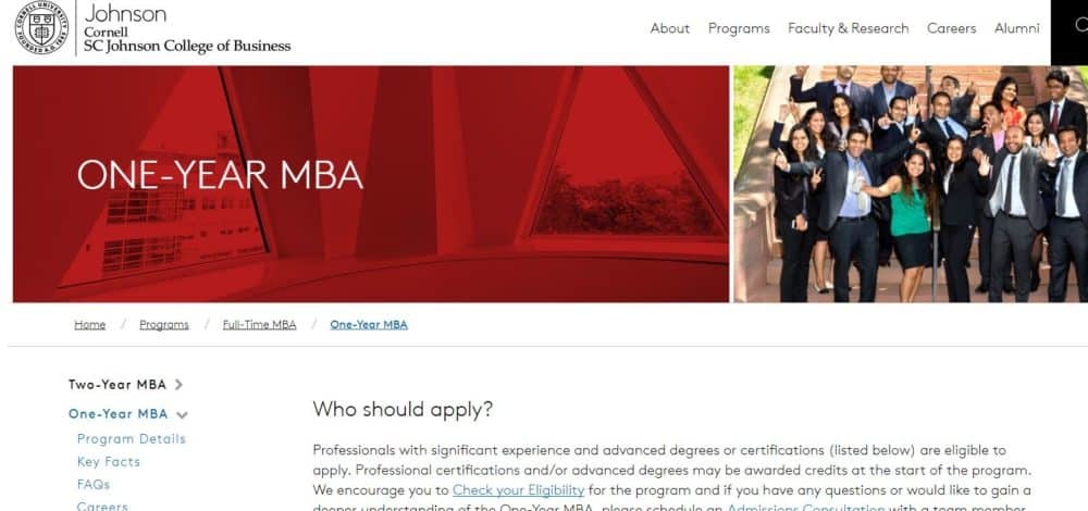The Cornell University’s SC Johnson College of Business also offers a one-year MBA degree which is an accelerate program designed for established professionals who are targeting leadership roles or who want to advance their careers within the little time they have away from work.