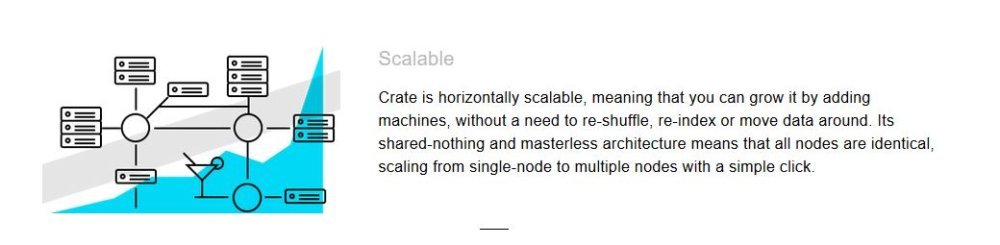 Enterprises and startups have deployed Crate clusters to power real time analytics, real time dashboards (network traffic, security events), IoT-backends (sensor data, telemetry data), ad-tech (web traffic), telecom apps (call logs, CDRs) and user-facing Web and Mobile apps.Crate is designed to support the huge scale of Web, mobile and IoT applications. Crate is horizontally scalable, means that can grow up by adding machines, without a need to re-shuffle, re-index or move data around. Its shared-nothing and masterless architecture, means that all nodes are similar, scaling from single-node to multiple nodes with a simple click.