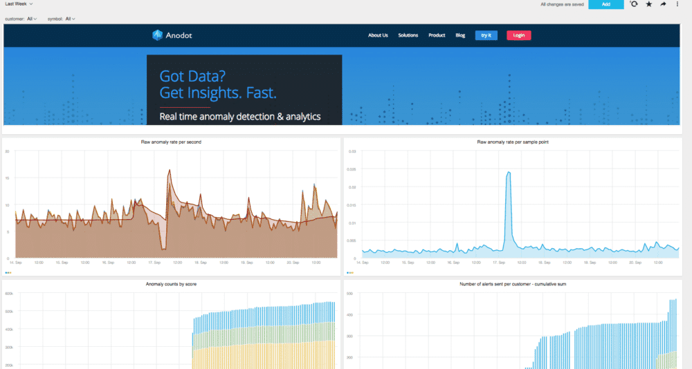 Anodot provides real-time analytics and automated anomaly detection for big data. Using patented machine learning algorithms, Anodot automates the discovery of outliers in vast amounts of data, isolates issues and correlates them across multiple parameters. Operating in real time, Anodot delivers business insights immediately, predicts events before they happen and supports rapid business decisions that help maximize revenues and production for Web-based, e-commerce, ad tech, IoT and manufacturing businesses.