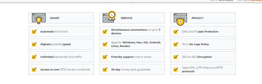 • KillSwitch: Instant blocking of all Internet traffic after unsuspected disconnection from the VPN • Virus & Website protection: Blocks malicious content and harmful websites • Force HTTPS: Automatically forces the usage of HTTPS protocol for websites • Ad Blocker: Removes ads from web pages and apps • DNS and IP Leak Protection • OpenVPN, L2TP-IPsec and PPTP protocols