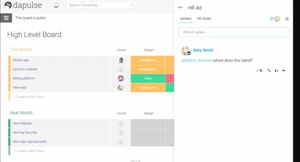 Dapulse lets users manage their team, track everything their team is working on and instantly see who's working on what and where things stand with just a single board.
