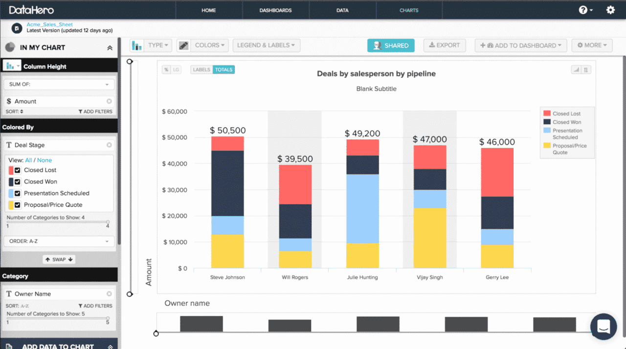 DataHero is the fastest, easiest way to get insights from your data - no coding or complex queries required. DataHero enables businesses to create charts, reports, and dashboards quickly and easily from over 40+ 3rd party data sources. Easily build KPI dashboards to track key metrics, automate client reporting with custom-branding, and share with teams, clients, and stakeholders - all from one cloud-based platform.