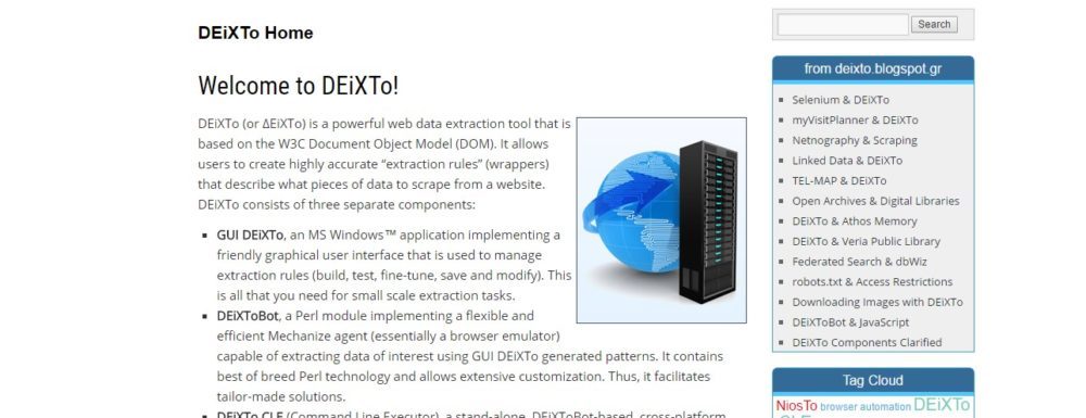 DEiXTo (or ΔEiXTo) is a powerful web data extraction tool that is based on the W3C Document Object Model (DOM). It allows users to create highly accurate “extraction rules” (wrappers) that describe what pieces of data to scrape from a website.