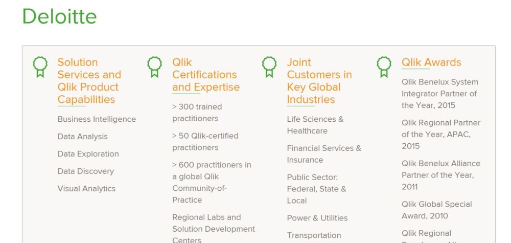 Deloitte and Qlik work together to provide clients with Deloitte’s strategic solutions and Qlik’s platform of business intelligence, and data visualization and design software. Deloitte helps enterprise clients improve the way they access, visualize, and interact with their data.