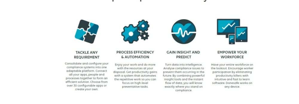 • Process efficiency: Create a system that automates the repetitive work & focus on high-level preventative tasks • A single solution: Tackle any compliance requirements in one adaptable platform • Empower workforce: Encourage worker participation by eliminating productivity killers with intuitive and fast to learn software • Automate and save time: Automate repetitive tasks in the background, like scheduled audits, training, and follow-ups