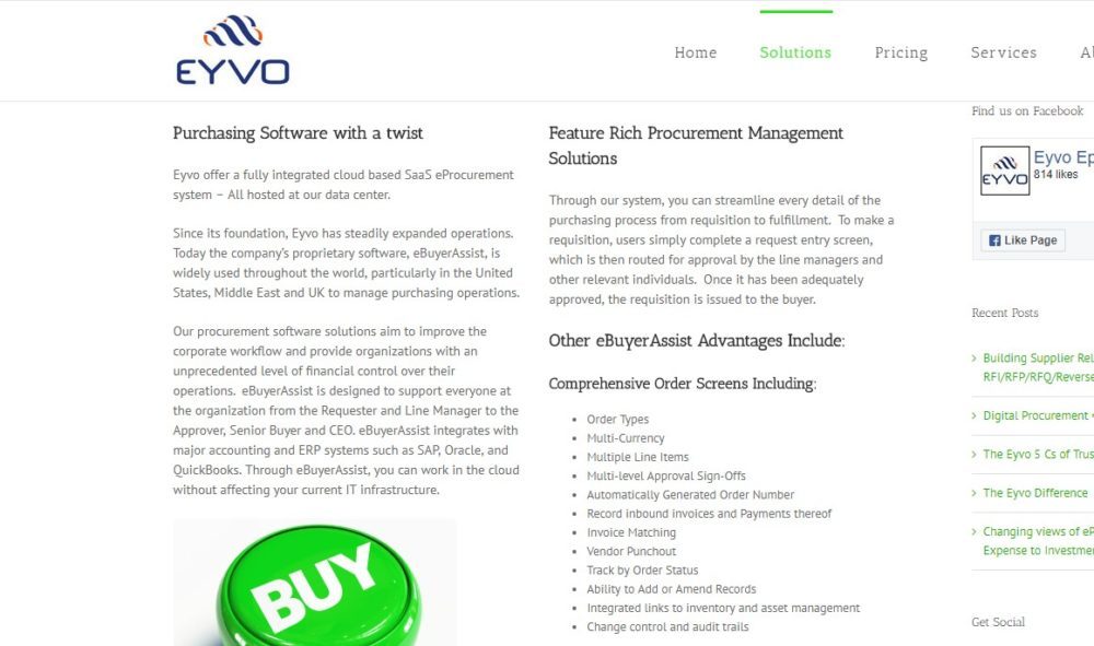 Eyvo is a fully integrated cloud based Saas eProcuement system used to assist all eSourcing and supply chain activities. Evyo aims at improving corporate workflow and provides organizations with an unprecedented level of financial control over their operations. Envyo can be used by small and large private firms, Governments and NGOs.
