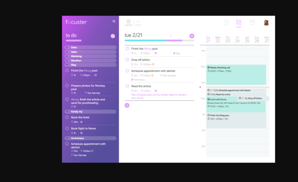 Focuster automatically schedules to-do list in the calendar, helping clients maintain focus, prioritize tasks, and achieve the most important goals every day.