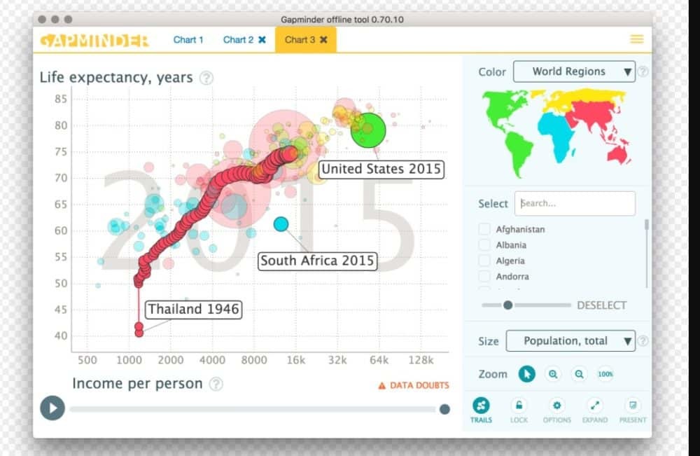 Gapminder makes global data easy to use and understand. It develops data visualization tools to let people explore the vast treasure of global statistics. It identifies the most ignored global facts by comparing what people think against the official statistics.