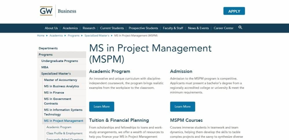 The George Washington School of Business’ Master of Science in Project Management is a highly specialized program applicable to all industries. Admission to the MSPM program is competitive. Applicants must present a bachelor’s degree from a regionally accredited college or university and also meet the minimum requirements. The MS in Project Management program aligns itself with the Project Management Institute’s PMBOK standards. Students will cover such topics as planning, scheduling, risk management, and cost estimation, and also learn project portfolio management and executive decision making. It is instructed by distinguished industry experts who bring realistic examples from the workplace to the classroom, and integrate those examples into the overall curriculum. The program features an innovative and unique curriculum that combines the core principles of project management with general management and leadership training. The curriculum encompasses personal and qualitative issues, as well as the technical, quantitative aspects of managing projects.