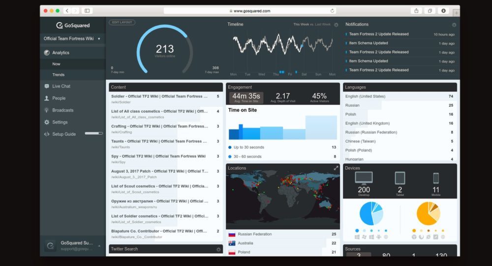• Gather feedback • Set up tailored Chat Prompts to engage visitors, capture leads, and win customers. • Evrything in GoSquared is in real time • Full Visitor History • GoSquared automatically looks up social profiles