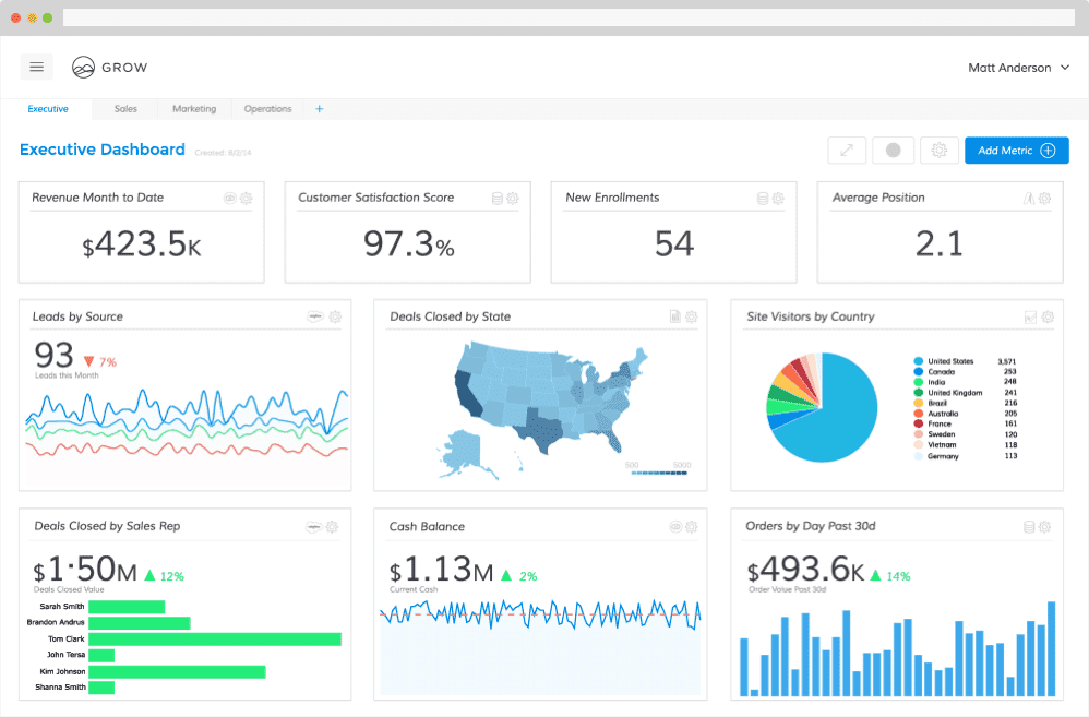 Grow is built for executives and teams of small to medium businesses who are frustrated by having to run time-consuming reports with scattered information that’s quickly out-of-date. With Grow’s software, you can get the information you need, how and when you need it, and share it so everyone knows the score.