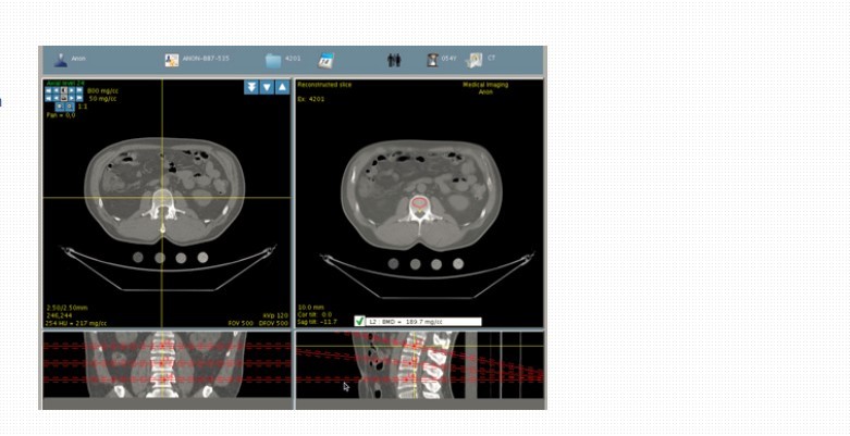 The spine BMD application applies fully automated software ROI placement for high accuracy and precision, ease of use and high patient throughput while the hip BMD utilizes CT 3D volumetric images to provide integral volumetric BMD and DXA like measurements of the hip. It also provides calibration phantoms, such as the Image Analysis, solid calcium hydroxyapatite phantoms and the INTable phantom.