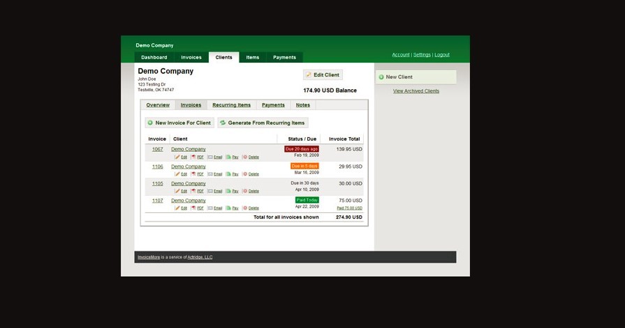 InvoiceMore is an online billing and invoicing web application. It provides a simple web interface for creating and sending invoices to clients and recording payments for them. Email and generate PDF invoices, print and snail mail them, and just keep track of your clients and their payments in an easy and organized way. With InvoiceMore, associate products and services with clients and pick a recurring interval for that association. Then every billing cycle, invoices are automatically generated for that client from the recurring products and services that are due sometime within that billing period. InvoiceMore is the most client-centric online billing service on the market.