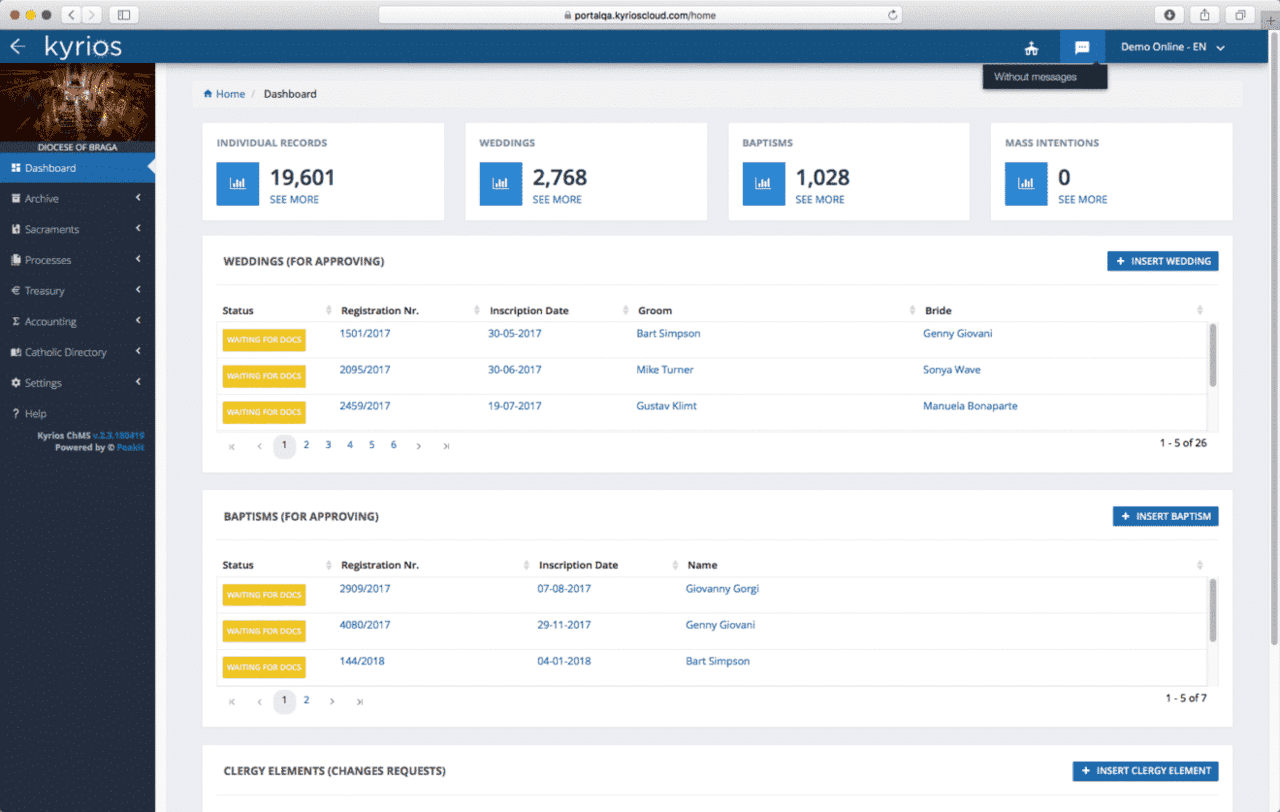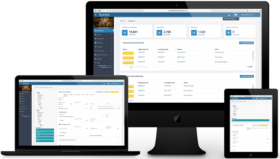 Kyrios ChMS is a Church Management Solution, responding to the specific needs of all the institutions that are part of the Church ecosystem (Dioceses, Commissions, Departments, Parishes, Movements, Fraternities ...) in terms of internal and external communication and also in terms of process management.