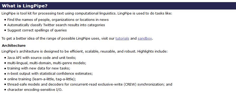 ADDITIONAL INFORMATION LingPipe is a tool kit that is used to process texts by using computational linguistics. It helps users find names, organizations as well as locations in news which contains valuable information for the organization. Its architecture is built to be efficient, reusable, scalable and tough. It works on multiple languages, domain as well as genre models. Online trainings are available for users who wish to use the program. LingPipe is a great tool for doing research ad well as analyzing data.