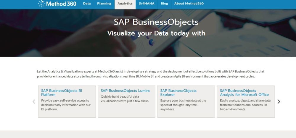 They are uniquely qualified to provide SAP customers with a complete data-to-decision solution. Let the Analytics & Visualizations experts at Method360 assist in developing a strategy and the deployment of effective solutions built with SAP BusinessObjects that provide for enhanced data story telling through visualizations, real time BI, Mobile BI, and create an Agile BI environment that accelerates development cycles.