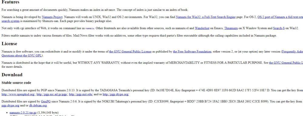 Namazu is a full-text search engine intended for easy use. Not only does it work as a small or medium scale Web search engine, but also as a personal search system for email or other files. Namazu is free software; users can redistribute it and/or modify it under the terms of the GNU General Public License as published by the Free Software Foundation; either version 2, or any later version. Namazu is distributed in the hope that it will be useful, but WITHOUT ANY WARRANTY; without even the implied warranty of MERCHANTABILITY or FITNESS FOR A PARTICULAR PURPOSE. See the GNU General Public License for more details.