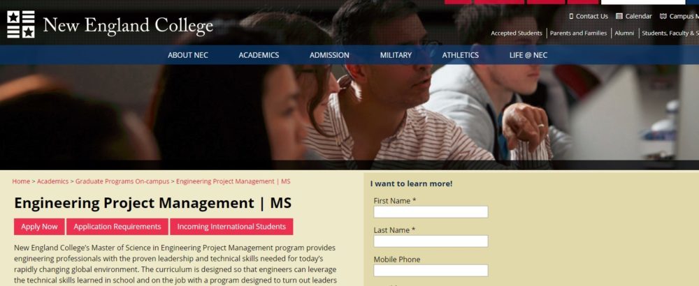 New England College’s Master of Science in Engineering Project Management provides you with the technical, leadership and managerial skills needed to become a successful manager who can manage complex projects to successful conclusions.