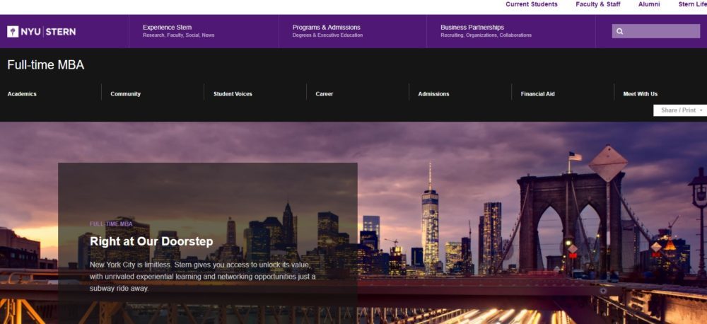 The New York University, Leonard N. Stern School of Business’ Full-Time MBA integrates innovative academic theory with hands-on, experiential learning opportunities that will support your growth as a leader who creates value for business and society.