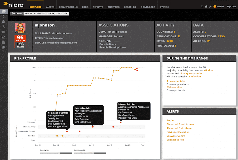 Niara Analyzer is a big data, analytics platform that builds constantly updating and historically complete Entity360 risk profiles that are context-rich security-dossiers for users, systems and IP addresses.