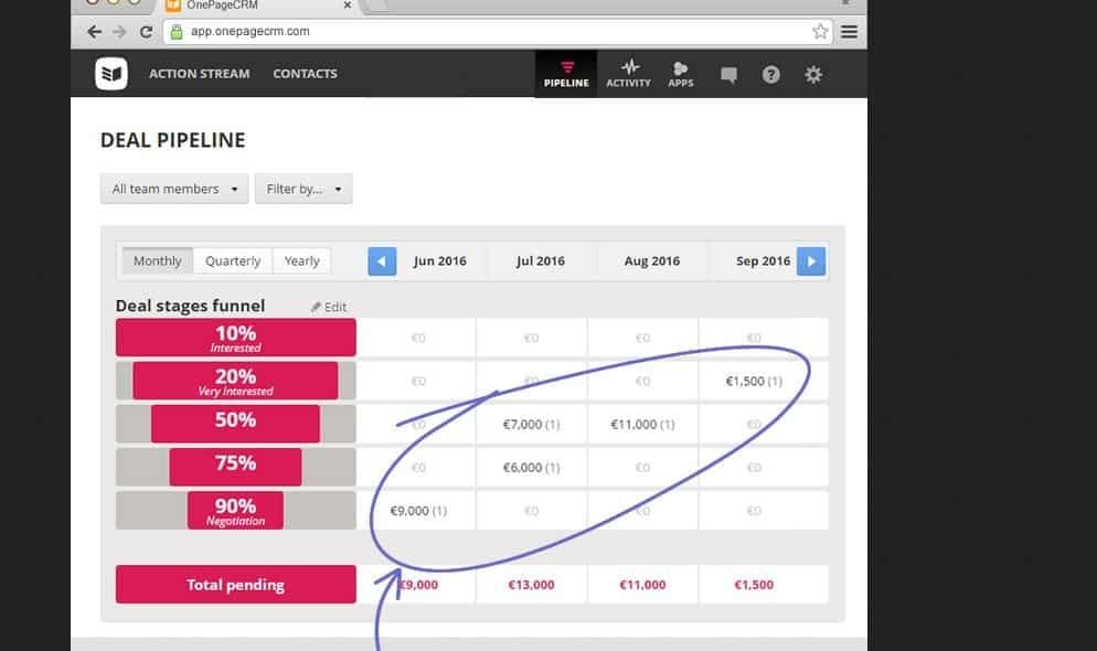 OnePageCRM also displays deals in an “Expected Close Date by Deal Stage” chart, creating an interactive pipeline that gives users a unique view of their sales, helping them to Predict, Motivate and Close more deals.
