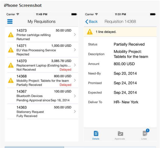 Mobile iProcurement: Employees can view and follow up on requisition status, including approvals and delivery, to help ensure timely delivery of their requests.