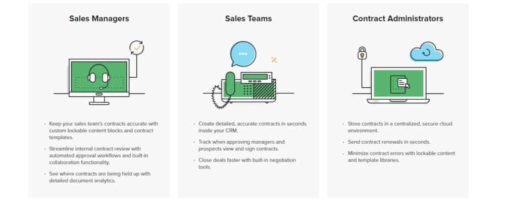 This solution includes creating contracts inside the user’s CRM, streamline contract negotiation and electronically sign contracts on any device. For Sales Managers, they will be able to keep the company’s sales team’s contracts accurate with custom lockable content blocks and contract templates. The Sales Teams will be able to track when approving managers and prospects view and sign contracts as well as Close deals faster with built-in negotiation tools. This minimizes contract errors with lockable content and template libraries.