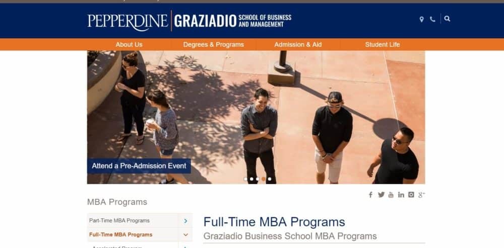 The Pepperdine Graziadio School’s Full-Time MBA provides students with an immersive educational experience at the magnificent Malibu campus. Pepperdine MBA experience involves a diverse and supportive environment as students come from all over the world. The program is taught by a professional faculty and features small, collaborative classes. To complete the Two-Year Full-Time MBA degree you require 61 credit hours covered in five trimesters that include a business internship. However, students with an undergraduate business degree may get a waiver on certain MBA courses and take electives in their place. MBA students are allowed to personalize their MBA curriculum by selecting a concentrated focus of study in order to complement their academic background and work experience. Students are encouraged to take up to 12 units of electives in this area and cover the remaining units on additional electives outside their particular specialization. These electives, which align with their professional and personal interests, present an opportunity for them to extend their breadth of knowledge. The Pepperdine Full-Time MBA areas of concentration include Digital Innovation and Information Systems, Marketing, Entrepreneurship, Finance, Dispute Resolution, Leadership and Managing Organizational Change. You will also get a chance to develop professional business skills and earn an MBA course credit through hands-on internship assignments. The program also places emphasis on experiential learning to complement the theory learned in class to ensure students are adequately prepared for the workforce by the time they graduate. There are also study-abroad options that help students gain international business experience in a week-long course or a full trimester abroad. They not only earn credit for the international study engagements but also study at the some of the school’s most prestigious partner universities in Asia, Europe, Latin America, Australia, or Africa. The Pepperdine Full-Time MBA also features accelerated One-Year program and another 15-month program which require fewer unit-requirements. Applicants of these programs should have completed a variety of prerequisite courses within the time of their application and have at least a few years of relevant work experience.