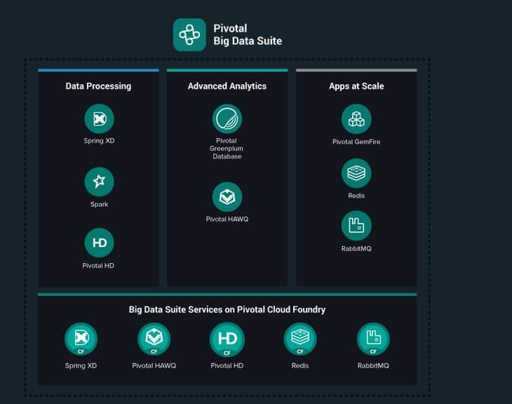 Pivotal Big Data Suite allows companies to modernize their data infrastructure, discover more insights with advanced analytics, and build applications at scale with a number of leading data products available to them at one subscription price. It includes recently announced application services that give developers the ability to leverage SQL and NoSQL databases, in-memory processing, and real-time environments to ensure high availability and resilience of strategic innovative apps. Pivotal Big Data Suite components can be deployed on commodity hardware, pre-certified appliances, virtualized and private cloud instances, and in public clouds.